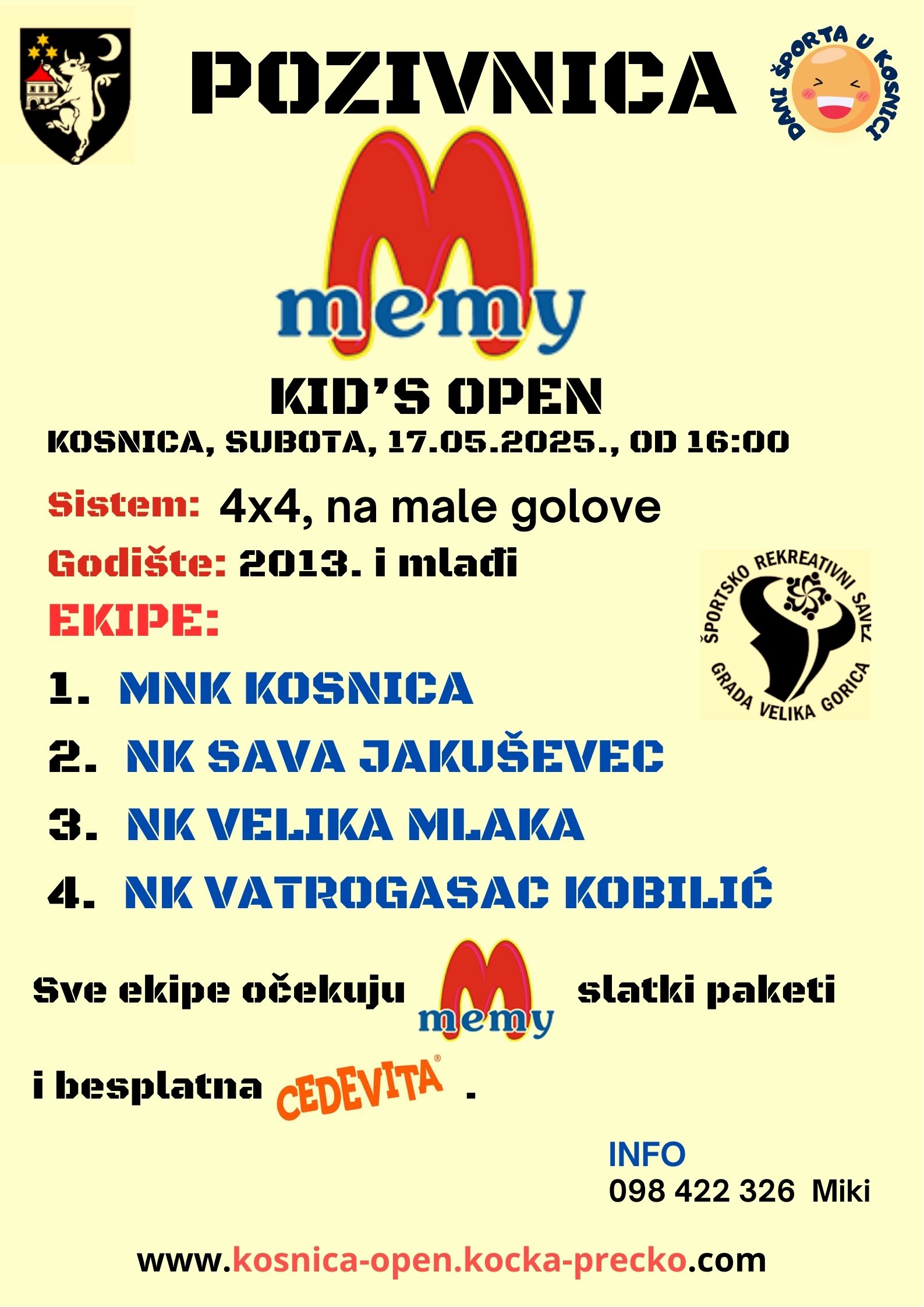 Osim klasičnog seniorskog nogometa, imat ćemo i 1. ženski Kosnica open, te dječji MEMY kid's open za dječake do 12 godina i mlađe (2013.).